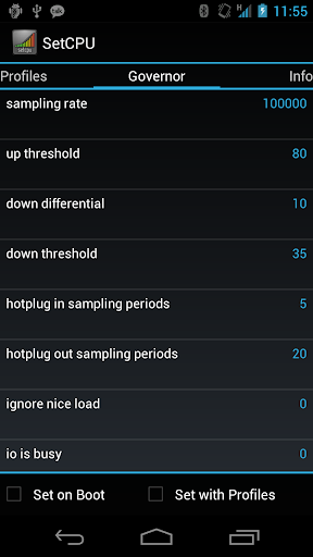 Conjunto SetCPU do recurso de largura torná-lo útil para iniciantes e entusiastas Android.Acelere o seu processador para desencadear o verdadeiro potencial do seu telefone multitarefa, ou discar a velocidade do seu CPU para economizar bateria.